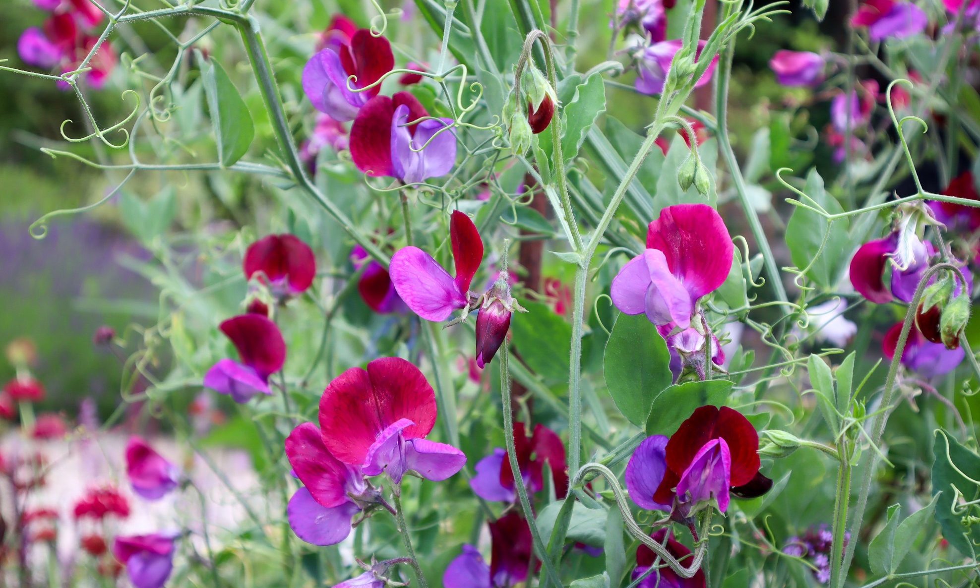 Also in this area is a fabulous display of sweet pea Matucana. This is an old variety, first recorded in England in about 1700. It has since been used in the breeding of modern sweet peas because of its outstanding fragrance. The flowers are bicoloured red and purple, and it has a long flowering season, continuing after many others have run out of steam. It has conveniently been planted close to the path for easy picking, and easy sniffing.