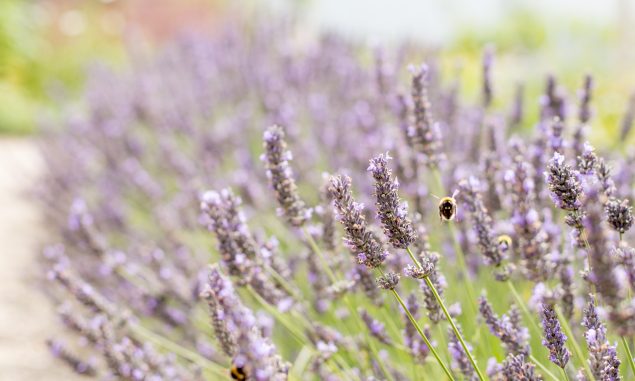 The lavender mini-hedges which edge the paths in are just breaking into flower. This will be a heart-lifting sight for several months. The variety is Grosso (Lavandula x intermedia ‘Grosso’), and apart from pruning, it has no special care, no feeding, and is easy to grow. It was planted in the summer of 2017, so this is its sixth year and it’s still going strong. It is a particularly vigorous hybrid which is used commercially because of its high oil content and strong fragrance. In the productive area, next to the children’s play area, is a bed with five different lavenders growing in adjacent blocks so customers can see and compare their growth habits.