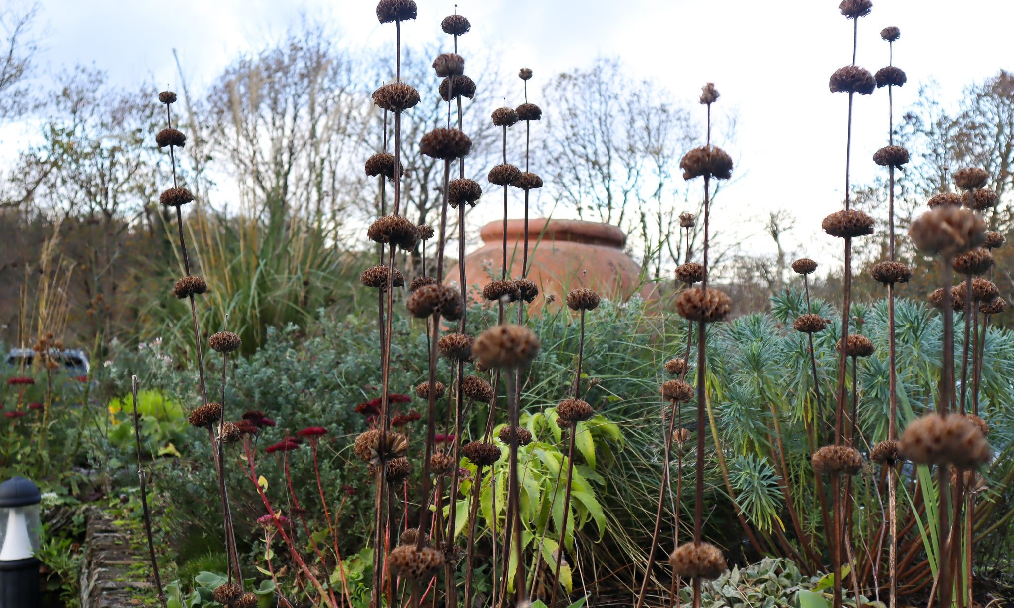 During winter the emphasis is on different qualities: coloured stems, berries, bark, scent, structural shapes, light and shadow are more noticeable. Spent flowering stems, especially with seed pods add interest and valuable refuge for overwintering insects. Sedum and Phlomis russelliana are good examples. Grass stems add structure in herbaceous beds. However, the golden stems encrusted with hoar frost pictured in magazines are rare in our mild wet Cornish climate, and grasses seldom last winter without becoming scruffy. Shrubs such as the contorted hazel and the wire-netting bush (Corokia cotoneaster) have interesting skeletons. Evergreen shrubs are a background to floral bounty in the summer, but as leaves fall and herbaceous planting dies down the evergreens reveal themselves as backbone structures. Shrubs such as yew and box can be topiarised, or just kept trimmed to contain their size. Other evergreens such as camellias have showy flowers visible from a distance and are worth siting to be visible from indoors.