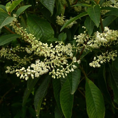 Handsome shrub. Long racemes of fragrant white flowers in July and August. Red and yellow foliage in autumn. Moist acid soil. Height 2-3m.