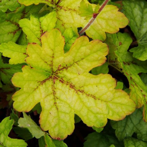 The deeply cut foliage in spring to mid summer is gold with red veins. In late summer, the leaves turn green with red veins. In autumn, the older foliage turns amber-pink. Small white flowers April-July. Height 9 inches. Grow in full sun in well drained soil. Will benefit from winter protection.