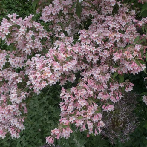 Beauty Bush. Graceful deciduous shrub with soft pink, bell shaped flowers in May and June. Any soil in sun or semi shade. Height 1½m.