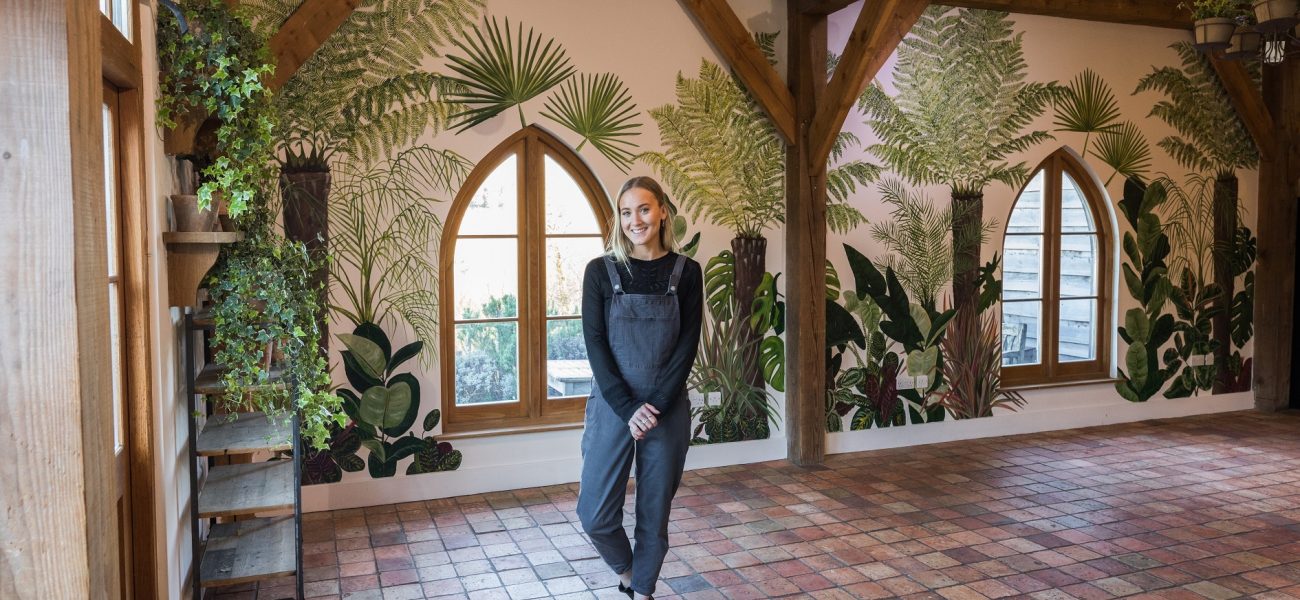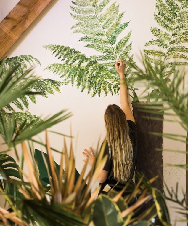 Whilst our gardens have been enjoying their winter sleep, here at the Nursery we have been busy collaborating with the incredibly talented artist, Florence Super. Florence (Flo) was on site for a week in February and has created a botanical spectacle on a wall inside the cafe. Here, we talk to Flo about her ideas, what inspires her and her universal love for the ocean and all plant life.