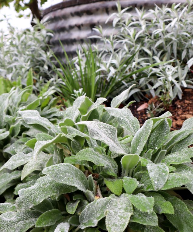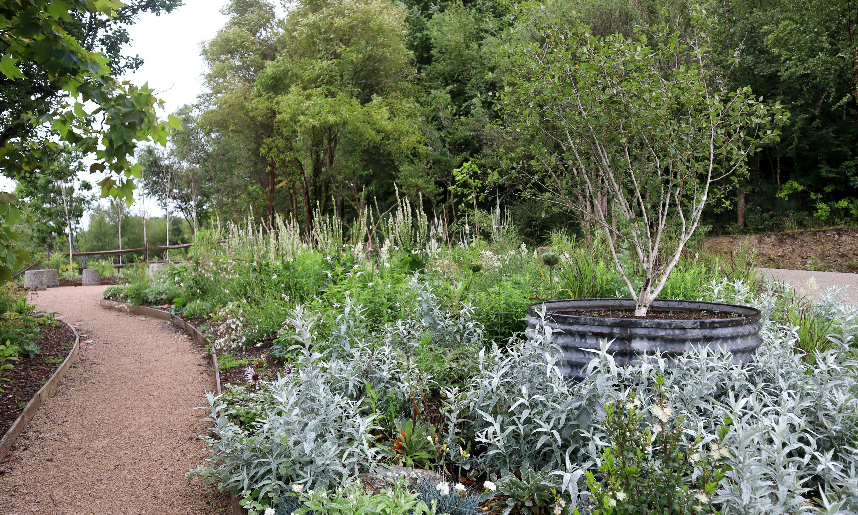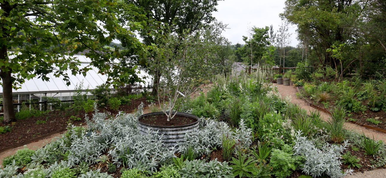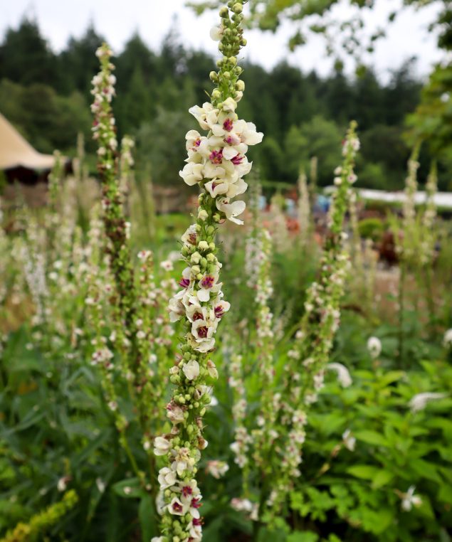 Above the glasshouse the moon garden has made great strides in this first season and is beginning to fill out. With a limited colour palette the different shapes and textures of plants become more evident, and more interesting. The following plants all have completely different forms. Stipa tenuissima is a clump forming grass looking like fine hair. Stachys lanata, lamb’s ears, has soft silver felty leaves. Lysimachia clethroides has strange bent flower spikes which give it its common name of gooseneck loosestrife. Verbascum chaixii ‘Album’ provides a vertical accent, and is a good plant to follow foxgloves earlier in the season. Vita Sackville-West called such plants minarets.