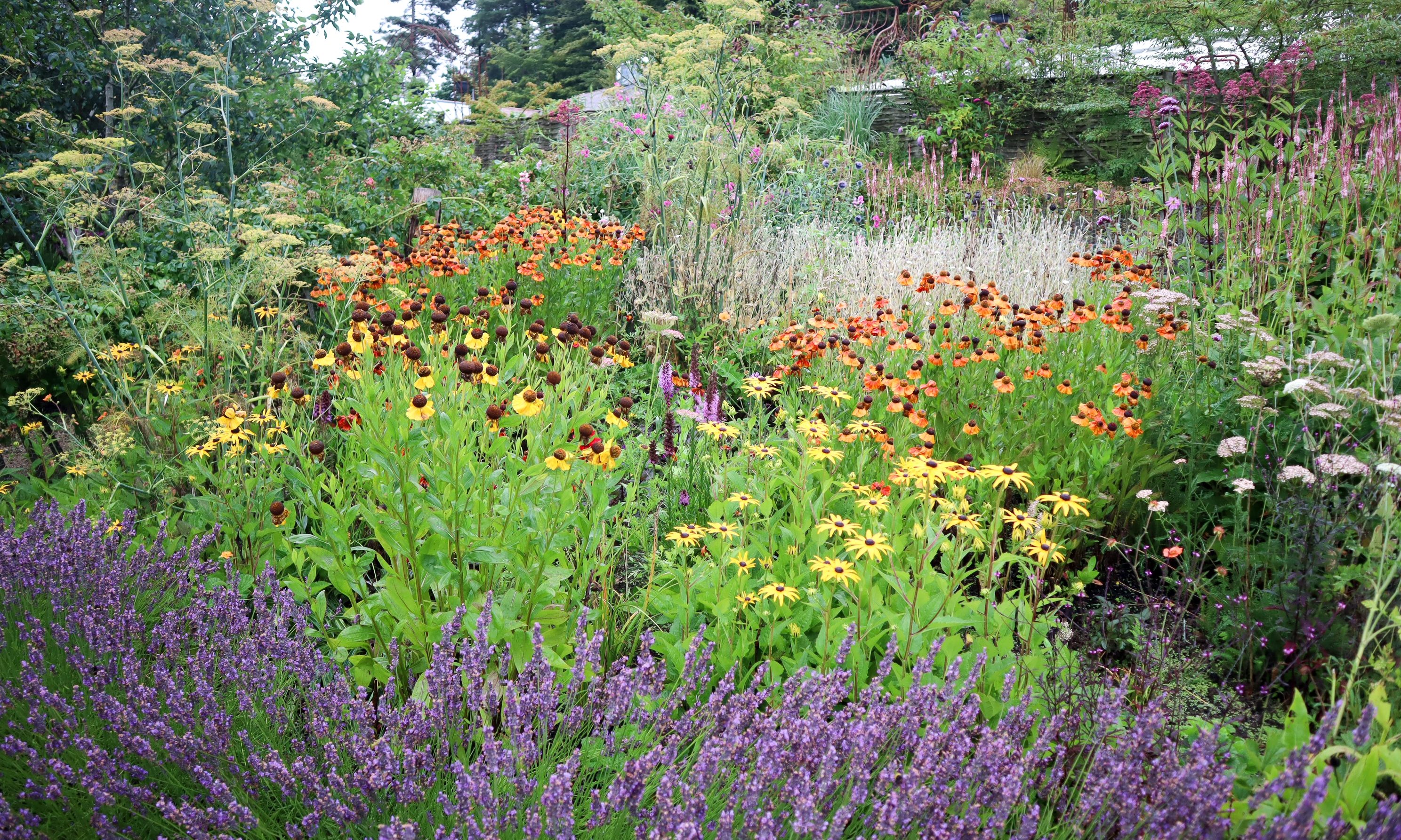 Proper rain falling on warm soil creates excellent growing conditions, and plants are growing at an astonishing rate. Growth normally seen in May and June finally arrived in July. Unfortunately the weeds are growing just as fast and plants which were not adequately staked earlier are flopping. Climbing through the flower beds propping up plants provides an opportunity to assess which need to be split or moved at the end of the season. It’s easier to assess how much room a plant needs while it is in full growth, rather than when it’s cut back to a crown in the autumn.