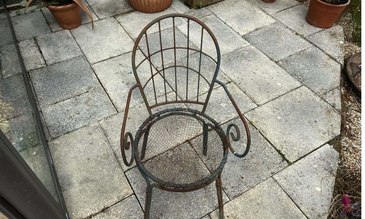 First, choose your chair, or stool, or sofa. The frame needs to be sturdy enough to take the weight of wet compost and plants. Make a sling underneath the seat for support and to contain the compost. Here we have used some old wire mesh fixed to the chair frame with wire. Chicken wire is ideal. Because of the final weight it must be securely fixed to the frame. If you were really lucky you might find a hanging basket that exactly fits into your seat. Next you need something to hold the compost in. You could use a ready-made basket liner cut to size, but here we have used a layer of moss which looks attractive and largely disguises the wire mesh.