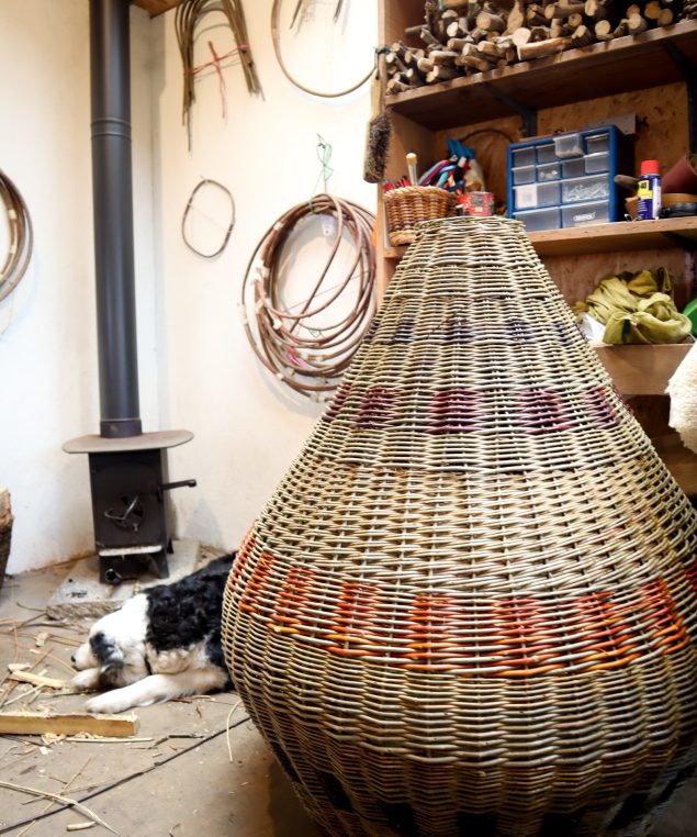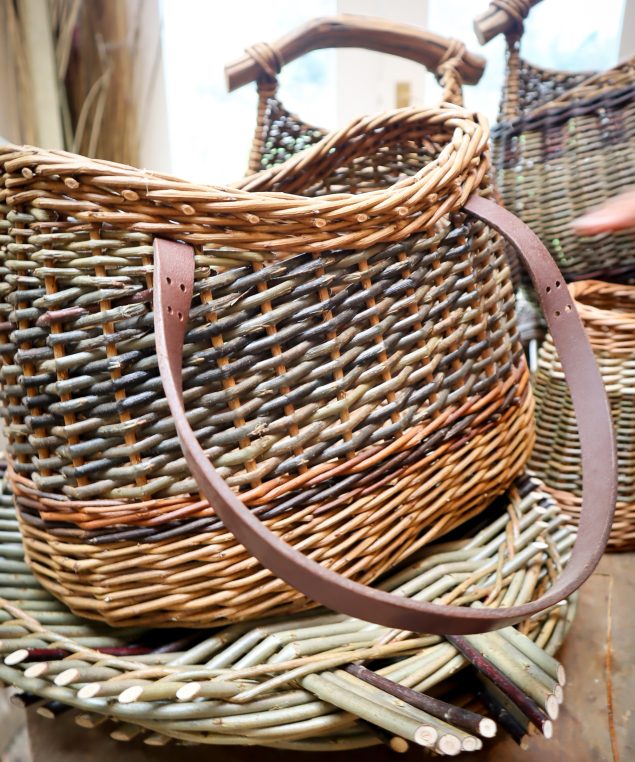 It all started about 25 years ago. After training as a landscape architect, she took a post-graduate diploma, and part of this involved a project making structures out of living willow. This sparked her interest. At that point in her life, it was something she could do without massive investment in machinery, land or workshop premises. To start with she made shopping baskets and log baskets. It was all about speed, and the need to be quick to make a living. Now much of her work comes from commissions, but she would like to take some time to do her own work, and explore new ideas. She particularly likes making the leather-handled handbags, and the baskets with driftwood handles, and says a basketmaker’s style develops with time. Basket making is far from a mindless task, there are endless mini decisions to make as the work progresses. “If you like making, you always want to improve.”