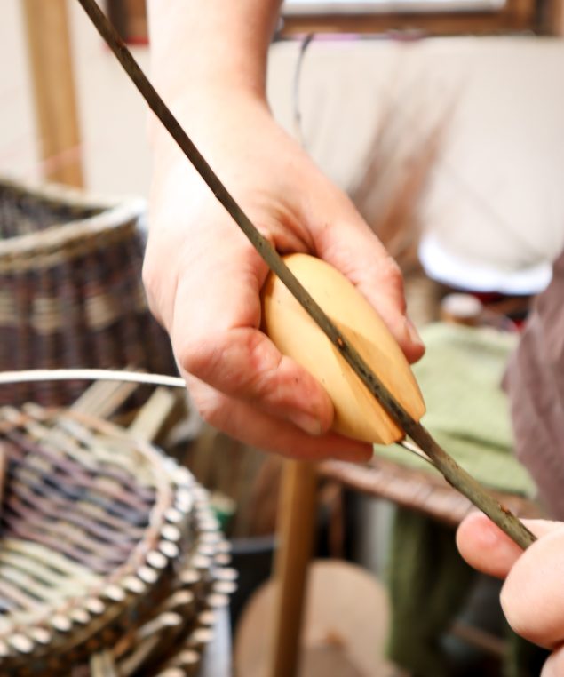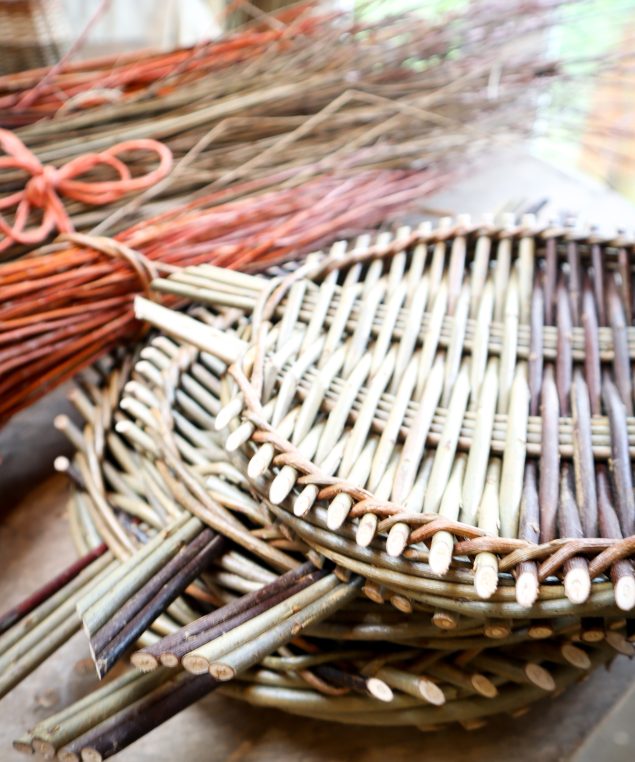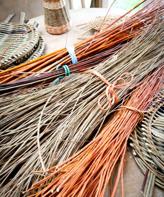 Before it can be used, the willow must be soaked in water for up to three weeks to prevent it shrinking. Once soaked it must be used within several days or it becomes unusable. This means a considerable amount of forward planning is needed for the work schedule. The whips can be steamed instead of soaked to speed the process up, but often colour is lost this way. It can also be stripped of its bark to make white willow, or split lengthways using a cleave. White willow is harvested a little later, as the sap is rising, because this makes it easier to strip off the bark. Each variety has its own characteristics in terms of colour, thickness and pliability, and growth habit. Some branch more than others, some don’t like the wind. Yelverton Orange has a “nightmare habit” but keeps its colour. Dark Dicks, Welsh Dicks and Brittany Blue are all favourites, as is Dicky Meadows. Basketry has its own tools, and language – slip, whip, spoke, weaver and cleave are all common terms.