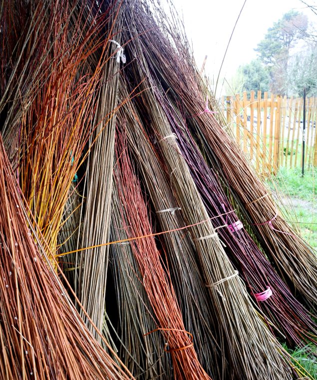 Lin only uses willow for her work. Almost all of it is home grown, but if extra is required it is sourced from Somerset where willow has been grown for centuries because of the perfect wetland conditions. The willow for the Duchy lampshades was all grown in Cornwall. She currently grows upwards of 35 different varieties. The first plantation was planted in 1999. Purchased slips of specific willow varieties (sections of thicker stems about eleven inches long) are simply stuck into the ground and allowed to grow. Willow has a six month growing season, and the whips (new branches growing from the original slip) are harvested annually, including the first year. There is no benefit in leaving them longer because they become thicker and have more side branches which makes them hard to use. Lin now uses a pollarding system, meaning the original plant is allowed to grow a permanent trunk to about hip height before breaking into new growth. This makes harvest easier as there is no bending. Commercially grown willow which is harvested mechanically is cut to ground level each year. The willow is harvested in January or February, depending on weather, but before the willow breaks into leaf which can be as early as the end of January down in west Cornwall. Friends and family help out. Lin describes it as a double harvest because the first job is bramble clearing. Every single whip is cut off using secateurs then the whips are sorted into lengths, tied in bundles, labelled and stored under cover to dry out for several months.