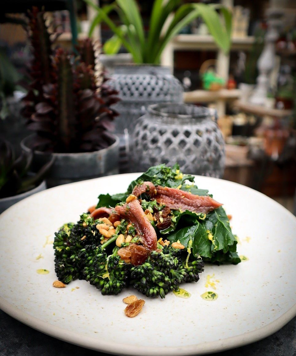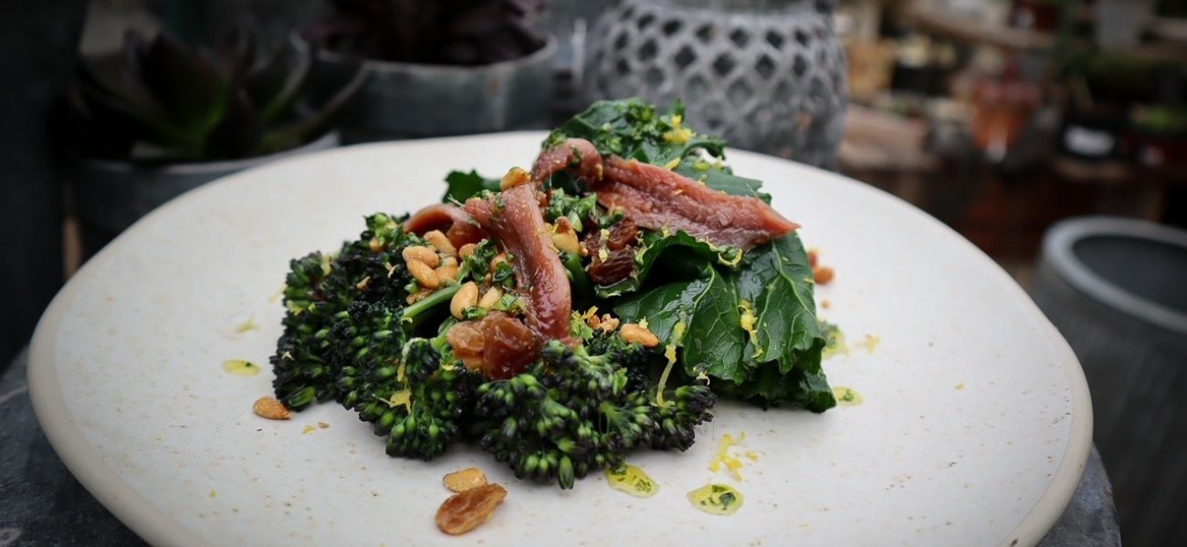 Purple Sprouting Broccoli, Pine nuts. Sultanas & Anchovies