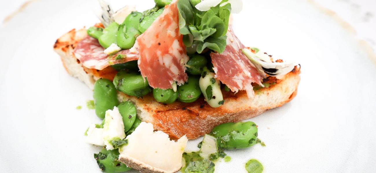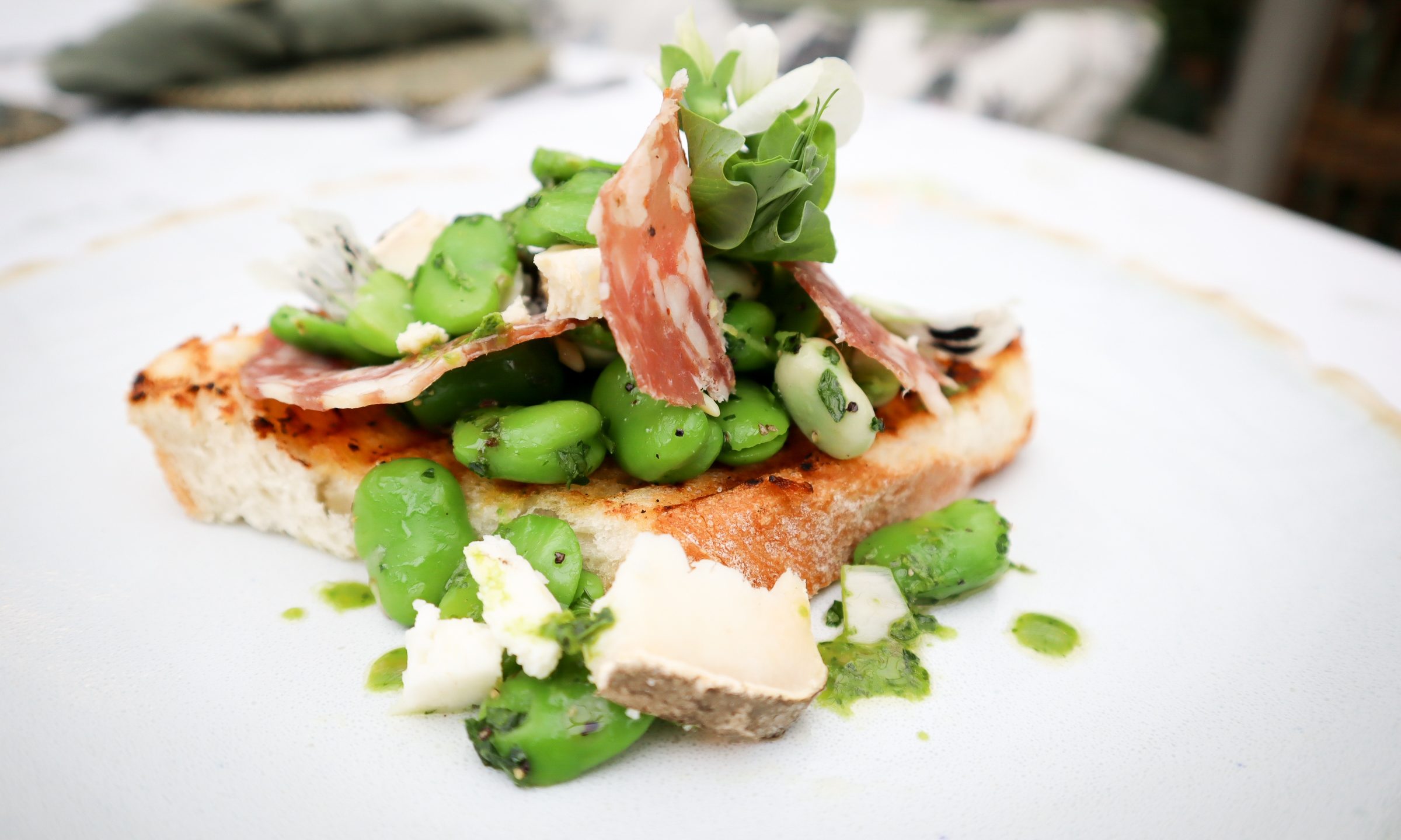 Nursery broad beans on grilled bread, Cornish garlic salami & Cornish goat's cheese