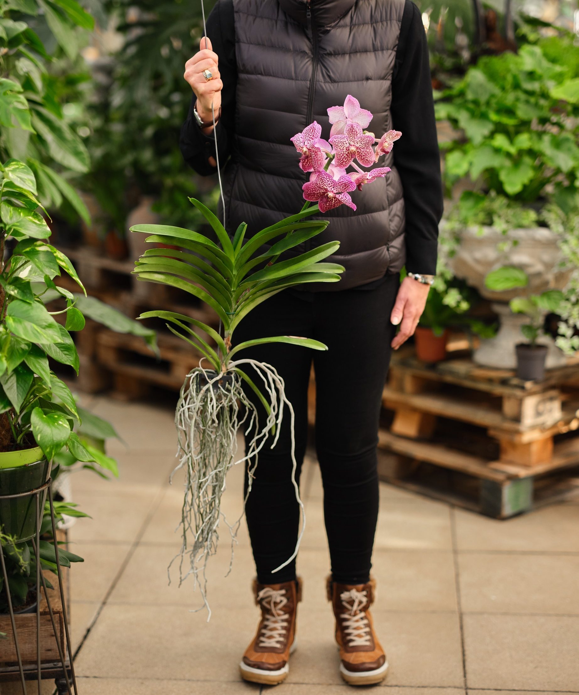 Vandas, with huge showy flowers, ideal in humid bathrooms or kitchens and only needing a light spray of water on the aerial roots.