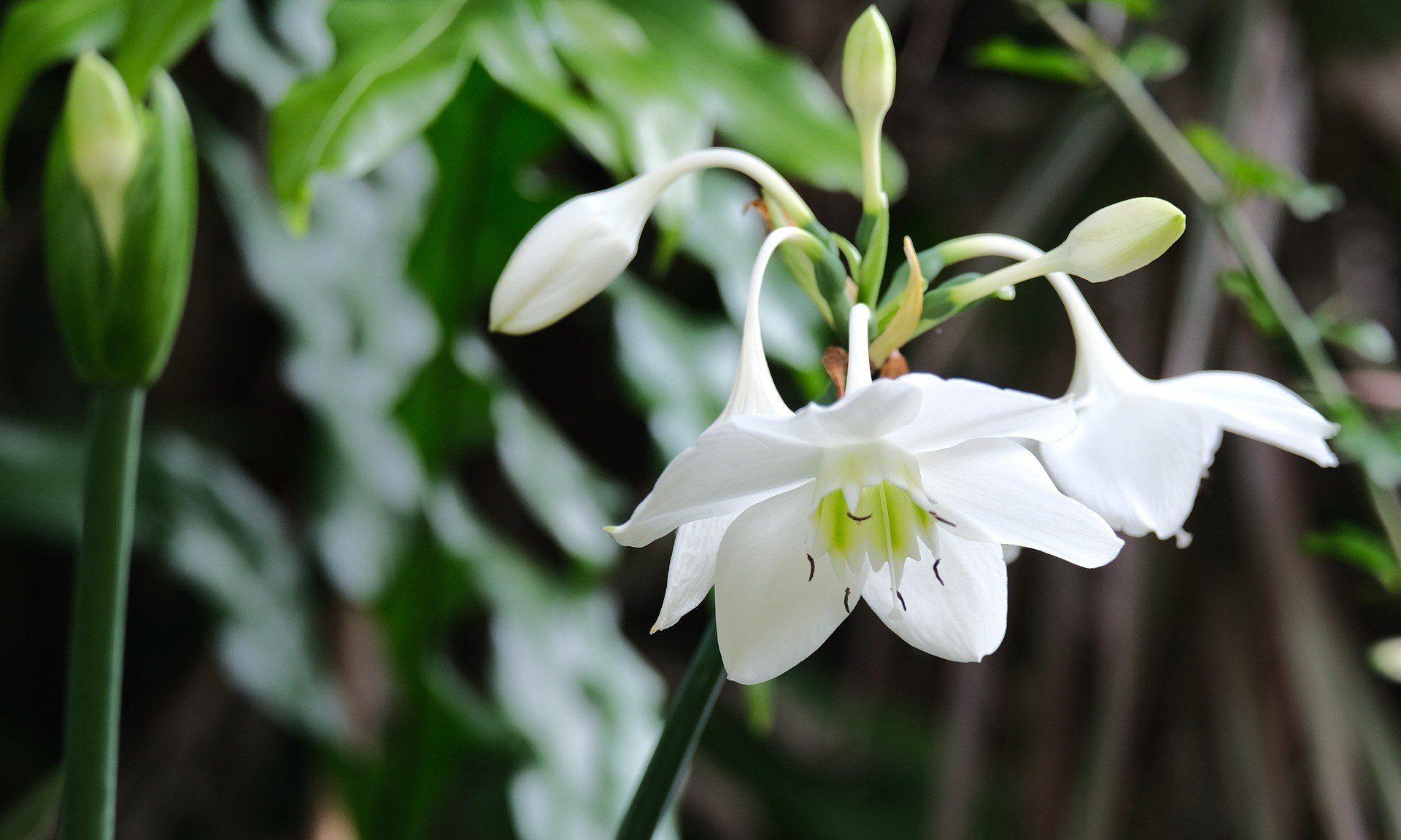 Caroline’s choice is a bit of a wild card because it is a tender bulb from Peru which needs to be grown indoors or in a heated conservatory, but don’t let that put you off. It is long lived, reliable, easy to look after, exquisite in flower and the pots can stand outdoors in the summer months. It has glossy dark evergreen leaves and produces up to six pure white drooping flowers on each stem. The stems are strong and upright and about 50 cm tall. The elegant flowers last for several weeks, they have a shallow cup made from the fused stamens with a yellow-green interior and a delicious scent. It looks a bit like a cross between a narcissus and an amaryllis which is not surprising as they are all in the same family. If you can grow an amaryllis, you can grow a Eucharis.