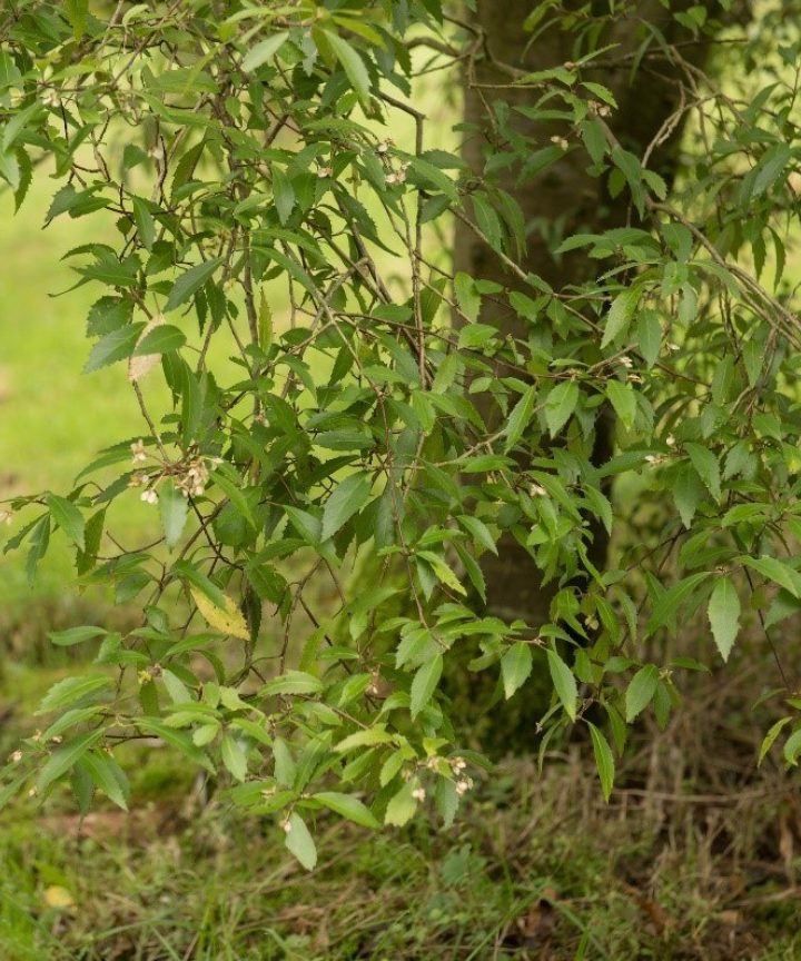 This is an exceptionally pretty semi-evergreen shrub or small tree. It is of relatively recent origin, the original plant being identified in Colonel Stephenson Clarke’s garden in Borde Hill, Sussex. This is a garden of some distinction containing the best collection of champion trees in Britain. Originally this plant was labelled as H angustifolia but is now thought to be either a clone of H sexstylosa or a hybrid between the two. Whatever, it is an easy to grow, well-behaved garden-worthy shrub. It has fresh green toothed leaves, most of which are retained over winter. It is smothered with small five-petalled snowy white flowers in late summer. These have long prominent stamens from a greenish centre and are fragrant and very attractive to pollinators. It requires a sunny sheltered site away from cold winds.
