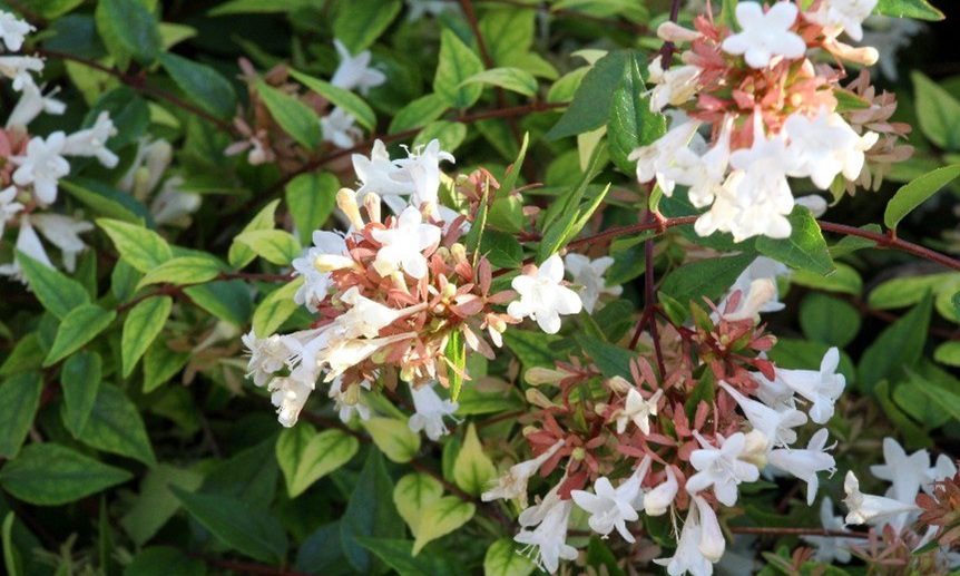 Abelias are a group of shrubs flowering in late summer and autumn making a welcome contrast to the ubiquitous hydrangea. Their attractive appearance and ease of cultivation make them desirable garden shrubs and have led to breeding programmes creating ever more varieties. They are evergreen or semi-evergreen, the leaves are small, some forms are variegated and some are golden . Their chief value however is the prolific flush of small pink or white flowers. These stand up well to rain and wind and are very attractive to bees, frequently causing the whole bush to buzz. The flowers last for weeks but after they fall the calyces remain, giving the bush a different but equally attractive appearance and extending the period of interest. New shoots and leaves are bronze tinted.