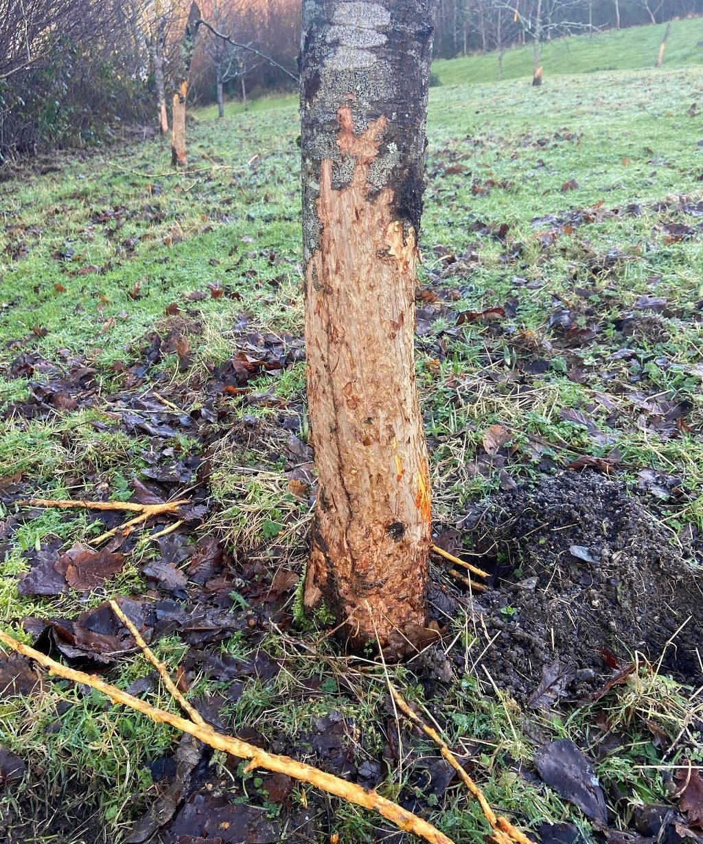 In December we noticed some damage to the bark at the base of the trees, extending as high as twenty inches above ground level. This damage has accelerated with the majority of the trees now completely ring-barked, or girdled. This means the bark has been removed all the way round the trunk, and the tree will die as a result.