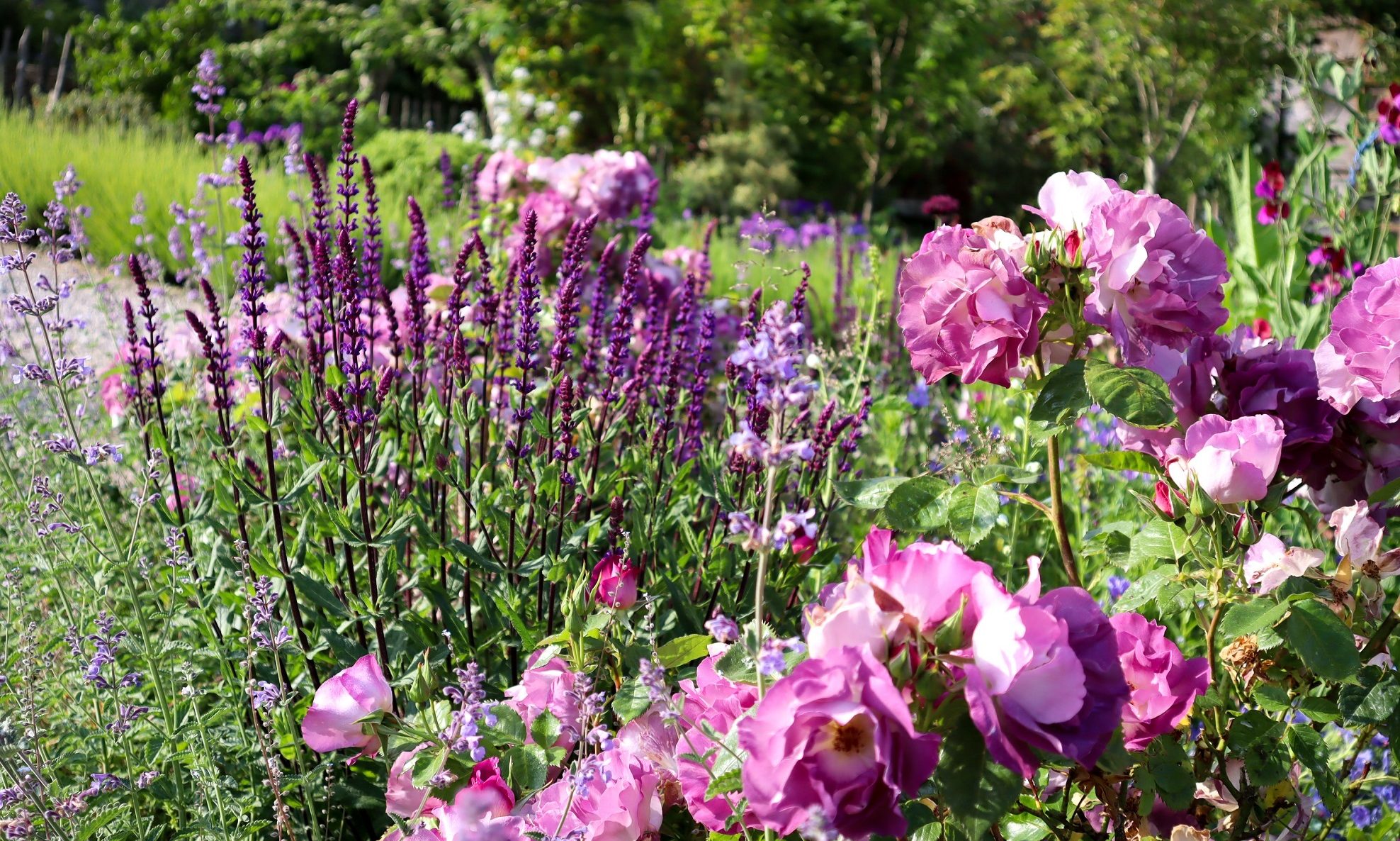 There have been various fashions for growing roses over the years. Gone are the days of serried ranks of identical rose bushes, rigidly pruned with bare ground underneath; now they are largely grown in mixed plantings, and as climbers. Nepeta and hardy geraniums are frequently used to underplant roses, their varied colours and form making attractive combinations, but there is another group of plants which is becoming increasingly popular in this situation. Salvias, or sages, have a distinct advantage in that they help control blackspot. They are aromatic plants which release scent as they warm up in the sun. Their scent profile contains sulphur which has fungicidal properties. As the scent wafts up through the rose bush it significantly inhibits fungal growth. Don’t be put off by the idea of sulphurous fumes drifting through your garden, you will not smell eggs.