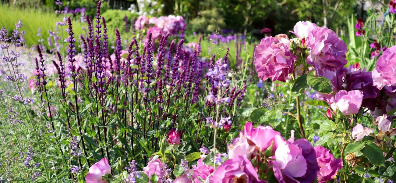 Recommended herbaceous varieties include S nemorosa ‘Lubecca’ AGM, ‘East Friesland’ AGM and ‘Caradonna’ AGM (which can be seen in the bumblebee garden next to Rose ‘Blue for You’), S x sylvestris ‘Rose Queen’ and ‘Mainacht’. The Wish series are a modern introduction which are good performers. S ‘Amistad’ AGM and the similar pink ‘Amante’ are excellent too. Some of the taller herbaceous varieties will be unsuitable beneath a rose because of their height, but can be planted between and among roses. There are many stunning tall varieties in vivid pinks, blue, and purple, not to mention S confertiflora which is a striking brick red. The hardy perennial varieties can be cut back after the initial flush of flowers, and they will rebloom.