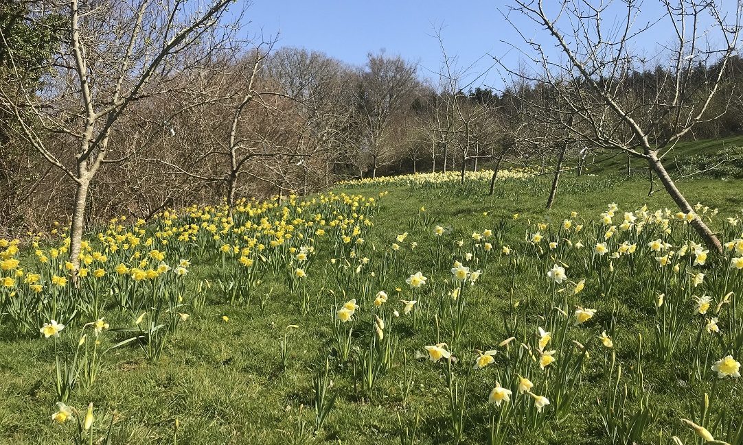 Those endless grey, cold, sodden, windy days of last autumn seem like another century but we were busy planting daffodils. Three thousand bulbs in three varieties were planted in the orchard area adjacent to the car park. They were planted in overlapping patches around the trees to try and create an “instant natural” effect. Despite planting the bulbs in near mud at times they came up in defiance and looked spectacular. Meanwhile our gates were locked and they had no audience so this is to show you what you can look forward to next year.