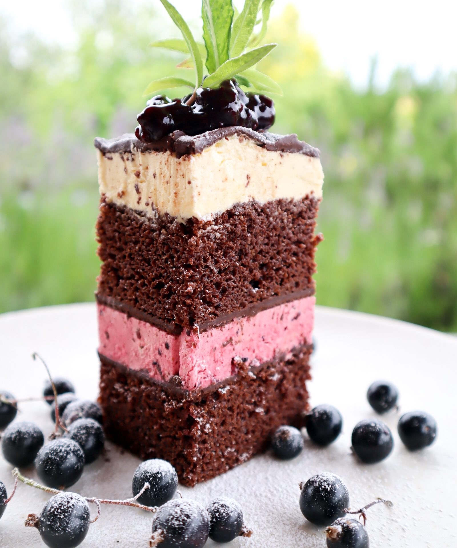 Cut large, showy wedges of this cake and garnish with more blackcurrant compote and sprigs of icing sugar dusted fresh mint. Rich and decadent, with a tangy depth by grace of the glorious blackcurrant. Served best with a double espresso licked with Irish whiskey.