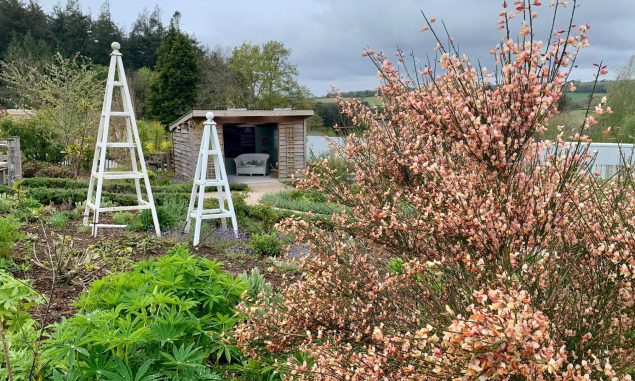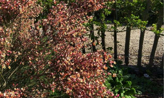 There is a bit of a lull at the moment in the bumblebee garden. The spring bulbs have finished, and the roses and nepeta are still in tight bud, and not likely to budge until we have warmer nights. Primroses are still in flower, and Aubrieta, Ajuga and Cerinthe are adding colour. The bees are mainly getting their food from the forget-me-nots, Symphytum (comfrey) and Pulmonaria. The latter two are not wildly exciting to the human eye, but the bees seem keen. Broad beans, leeks and peas have been planted in the veg garden, and February-sown sweet peas planted in numerous spots. The star performer at the moment is Cytisus Zeelandia which has been making a show for several weeks.