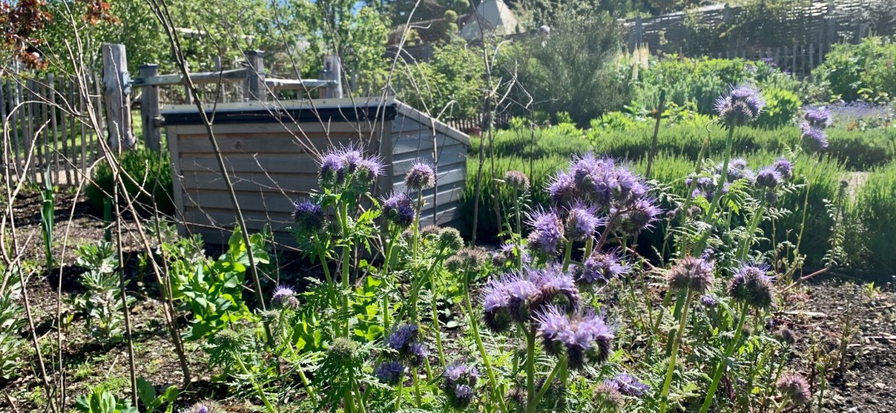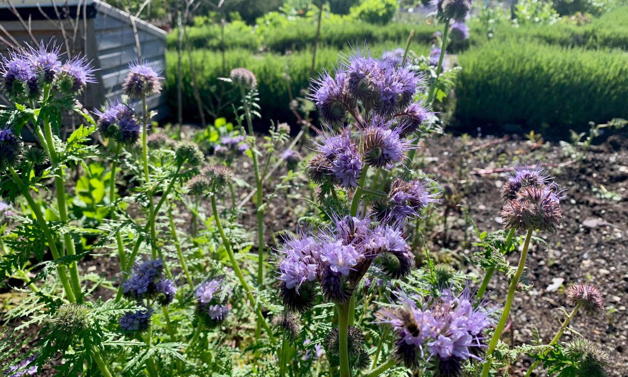 Also in the vegetable corner is a patch of Phacelia tanacetifolia. This gets its common name, fiddleneck, from the shape of the emerging flower spikes. It is extremely attractive to pollinating insects which is not surprising as it is a member of the borage family. It is used by gardeners and farmers alike as a green manure, and because it is not related to any vegetable crops it can be used without spoiling a crop rotation cycle. It conditions the soil and suppresses weeds. The sight of a whole field in bloom is reminiscent of a lavender field (but without the fragrance).