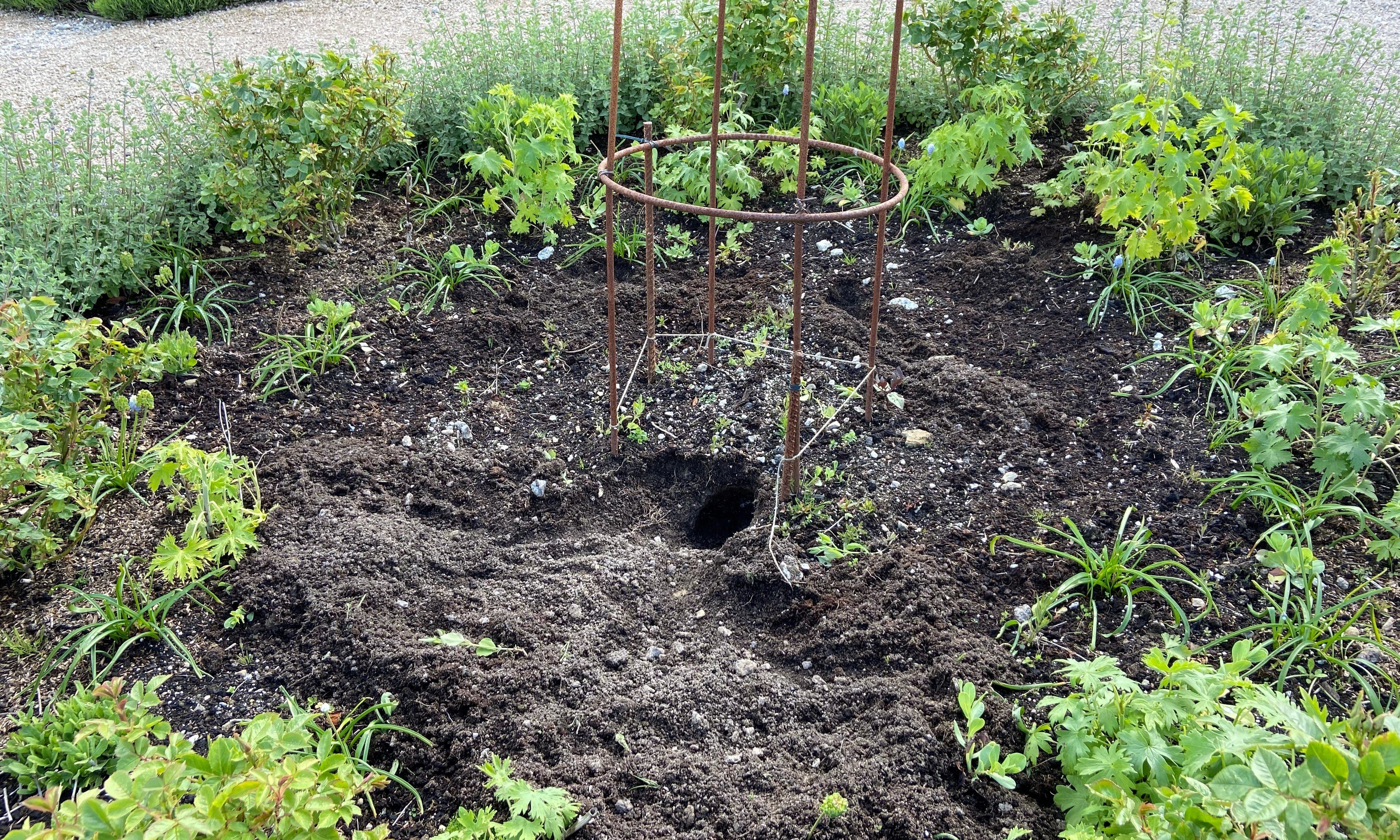 Unfortunately, life in the bumblebee garden is not perfect; we had an intruder. Overnight a rabbit got in and started excavating a hole right in the middle of the round central flowerbed. It has dug up cosmos and sweet pea seedlings, young plants of Cerinthe and some Verbena bonariensis. Fortunately, there are more young plants around to fill the gaps. This year seems to be particularly bad for rabbit damage.
