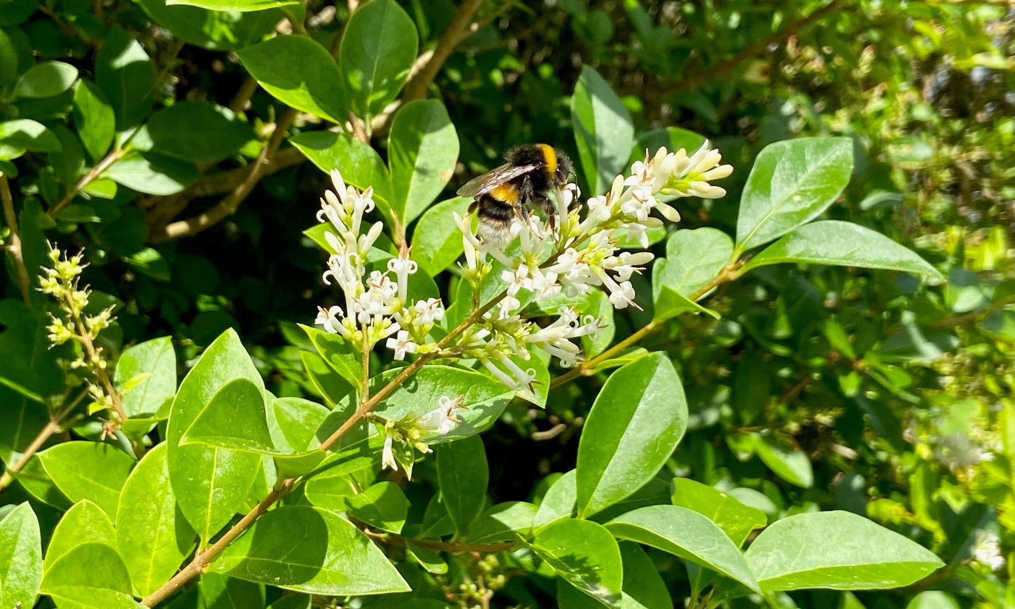 At last the lavender is fully out and is attracting masses of pollinators; bumblebees, honeybees and butterflies. A truly wonderful sight. With the prolonged hot dry weather recently the garden was looking a bit hot and scratchy, and the flowers a little bleached but some gentle rain this week has refreshed the foliage and rinsed off the dust. The privet hedge which was planted in late spring 2019 along the lower edge of the garden is flowering too. Privet flowers are very popular with pollinators, including moths, and whenever possible privet hedges should be left to flower before being trimmed.