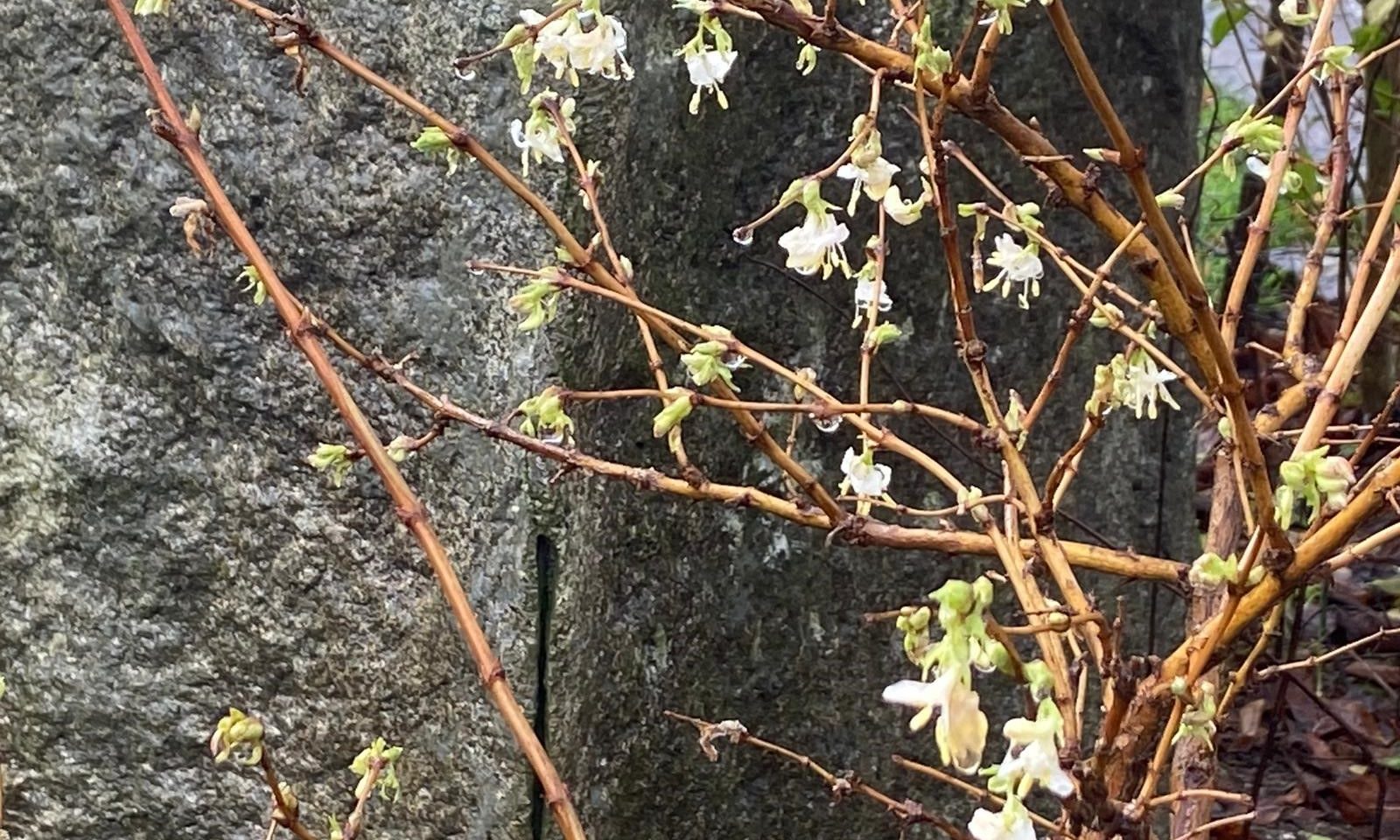 Fortunately there is, as planned, a selection of flowers already out in the bumblebee garden ready for that vital first feed, though the bumbles seem to be favouring Crocus Ruby Giant, one of the very few crocus bulbs to have survived the ravages of mice and voles. They are having to share these with the honeybees which are coming down from the hives on the hill above the nursery. There are also snowdrops, pulmonarias, comfrey, daffodils and of course hellebores all flowering. Winter honeysuckle, Lonicera fragrantissima, is the first shrub to flower. It has small creamy white fragrant flowers on naked stems. The next will be flowering currant, Ribes sanguineum, which has fragrant leaves as well as flowers. This is one of those plants with a scent you either love or detest. A stem cut in bud and kept in a cool room will open slowly and fill the air with a summery currant smell.