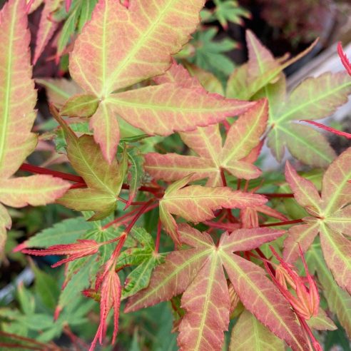 (Coral Bark Maple) Small tree to 2-2½m. Conspicuous coral-red stems in winter. Green leaves turn soft canary-yellow in autumn. Good soil in sun or shade. Best in a sheltered position.