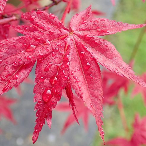 One of the best small bushy Japanese maples growing to 2-2½m. Green leaves turn brilliant scarlet in autumn. Any good soil in sun or partial shade. Needs shelter from cold winds.