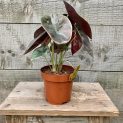 A rare collectors plant. Stands out for the sheer black, purple and red gloss of its leaves. A statement houseplant. Min temp 15C. Prefers bright indirect light. It is important not to over water this plant make sure the compost is totally dry before soaking completely.