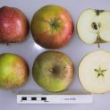 Dessert/Cooking. Sweet-sharp fruit mellowing to a rich flavour. Large green fruit turning yellow with red flecks. Vigorous heavy cropping tree. Pick October. Use October-April. Pollination Group 4.