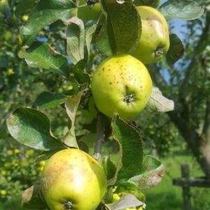 Dessert. Medium, crisp and juicy apple. Partly self-fertile. Heavy cropper. Easy to store. Eat through the winter. Pick Oct. Use Nov-Jan.