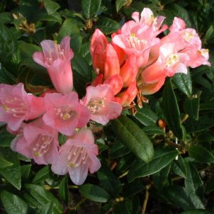 (Knaphill) Deciduous shrub. Vivid salmon-pink (can have white flower colour variation) scented flowers in May-June. Moist acid soil in a sheltered shady position. Height 1½m.