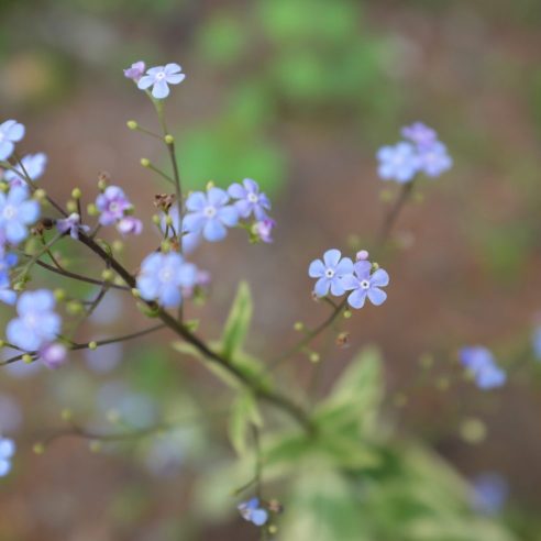 Blue forget-me-not flowers on 40-50 cm stems above large dark green leaves with a broad cream border. Good ground cover in any moist soil in full or part shade.