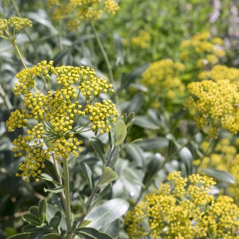 Evergreen shrub with sea-green foliage. Yellow flowers from July-September. Any well drained soil full sun. Excellent coastal plant. Height 2-3m.