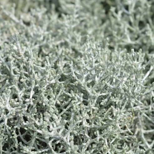 Short lived evergreen small shrub, intensly silvery-white stems and tiny leaves, up to 0.16 inch long (4 mm), barely bumps on the stems. The plant needs little water when established and well drained soil, in full sun. Good salt resistance. Height 30-90 cm, up to 90cm spread. Hardy to 24°F (-5°C)