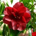 Very dark red semi double flowers with a few yellow stamens. Leaves have pronounced serration, on fast-growing, bushy plant. Flowers January to April. Needs moist acid soil and prefers light shade and shelter.