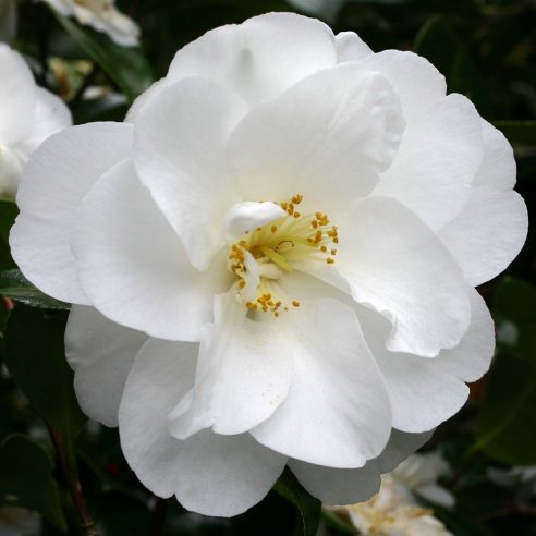Large evergreen shrub bearing large semi-double white flowers in spring. Acid soil only in a shady, sheltered position. Height 3m.+