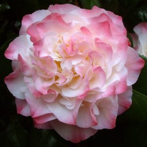 Evergreen shrub. Semi-double flowers, white with rose pink stripes. Feb-May. Best in acid soil in shade or partial shade. Good coastal plant. Height 3m.