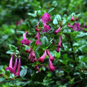 Evergreen shrub. Large bright pink formal double flowers, Feb-April. Upright habit. Acid soil only in semi-shade. Height 3m.