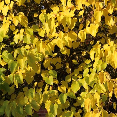 Deciduous large shrub or bushy tree. Tiny lavender-purple flowers in March and April before leaves emerge. New heart-shaped leaves emerge red, turning gold. In summer the gold foliage is burn resistant even in full sun. Any well drained soil in full sun for best leaf colour. Height 2-3m in first 5 years. 4m tall at maturity.