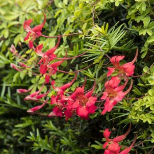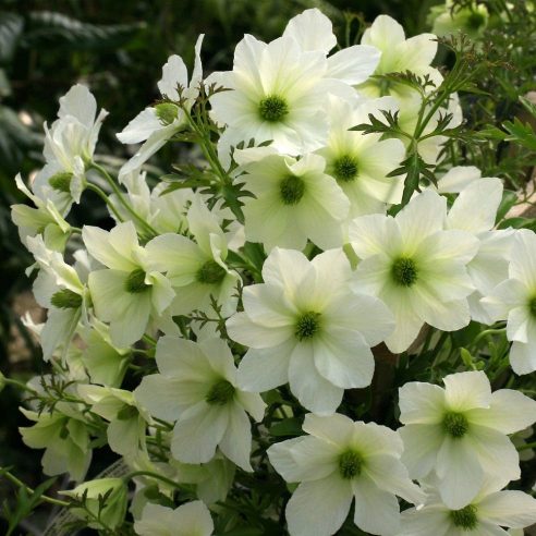 Evergreen. White flowers early to mid spring. Feathery foliage. Aspect: Sheltered south/west or conservatory. Prune out weak shoots after flowering. Rich fertile soil. Shade roots from sun. Height 2m.