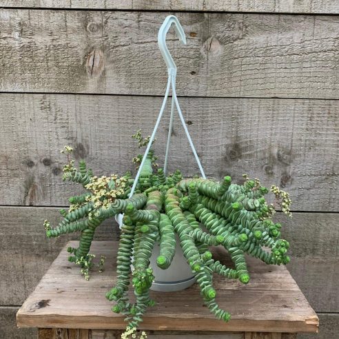 An unusual succulent with fleshy, circular leaves 'pierced' by a thin central stem. The lax habit makes it ideal for use in a hanging basket. Place in a sunny spot in the house or conservatory and allow compost to dry in between waterings. Over winter frost free and keep dry.