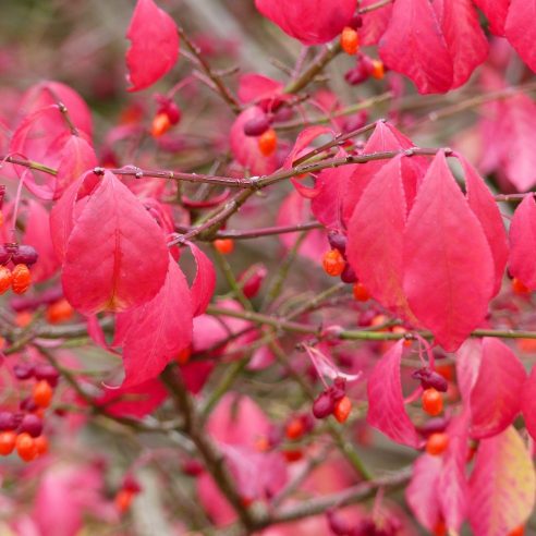 Slow growing dense and twiggy deciduous shrub. One of the finest and most reliable shrubs for autumn colour. Fruits are reddish-purple opening to reveal bright orange-coated seeds. Happy in any soil, particularly chalk, in sun or shade. Height and spread 1-1½m. HARMFUL IF EATEN