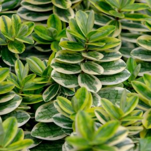 Attractive evergreen shrub with conspicuous white variegation. Good coastal plant. Any well drained soil in sun or shade. Height 1½m. HARMFUL IF EATEN
