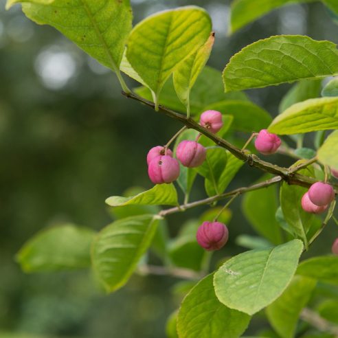 Deciduous shrub with distinctive winged corky stems. Conspicuous four-lobed pink fruits. Free fruiting. Any soil especially chalk in sun or shade. Height 4-5m. HARMFUL IF EATEN