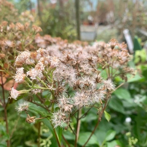 Evergreen shrub bearing large flat heads of white flower in summer and autumn. Bees and butterflies find it most attractive. Any good moist, well drained soil in full sun. Height 1½-2m.