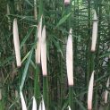 Elegant clump forming bamboo. Upright stature. Non invasive, tolerates drier conditions than most Bamboos and wind. New shoots in spring have beautiful clear white sheaths, contrasting with the dark green culms. Any moist fertile soil in shade or sun. Height 3-4m.